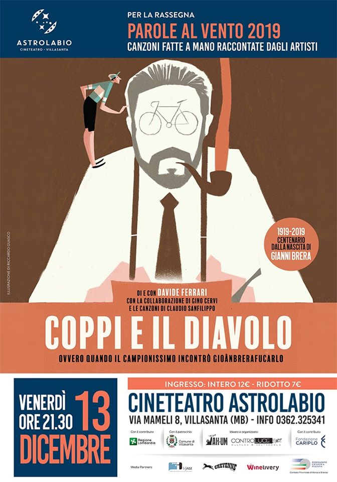 “Coppi e il Diavolo”, spettacolo di e con l’attore e regista Davide Ferrari, le canzoni di Claudio Sanfilippo e la partecipazione del giornalista sportivo Gino Cervi, andrà in scena al Cineteatro Astrolabio di Villasanta (via G. Mameli 8; ore 21.30; ingresso 7-12 euro) con il contributo di Regione Lombardia.