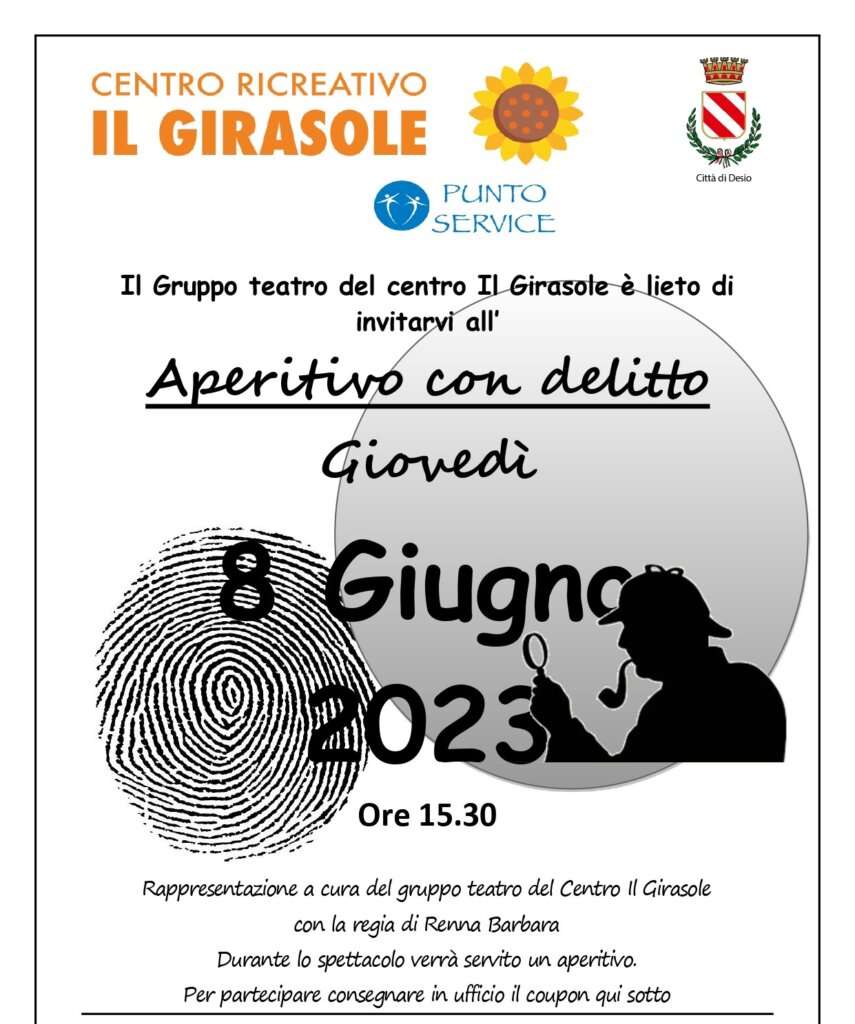 • Giovedì 8 giugno alle 15.30 andrà in scena la rappresentazione teatrale ‘Aperitivo con delitto’, un gioco di ruolo con aperitivo realizzato dal Gruppo Teatro dello stesso Centro.