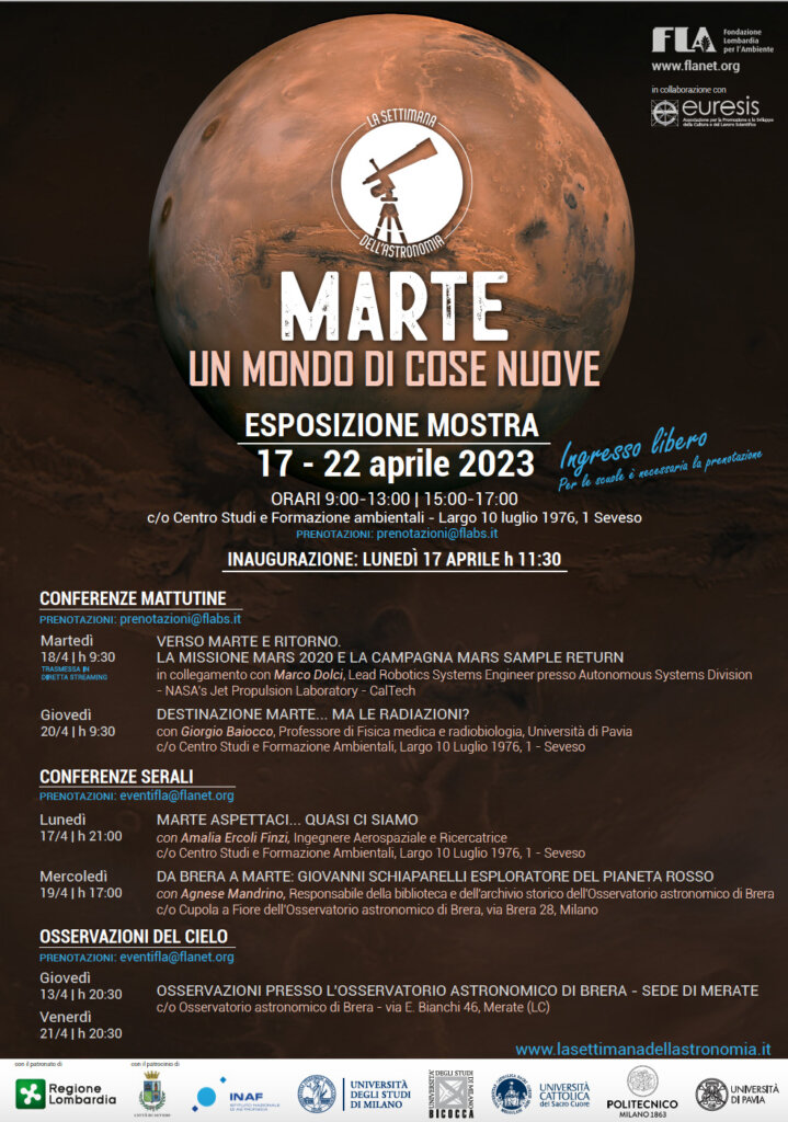 A partire dalla mostra “MARTE. Un mondo di cose nuove”, realizzata dall’Associazione Euresis e che verrà allestita dal 17 al 22 aprile negli spazi dell’Auditorium del Centro Studi e Formazione Ambientali di Seveso (MB), con possibilità di visita guidata per le scuole.