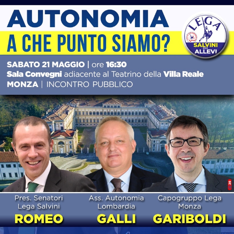 “L’incontro – spiega il monzese Gariboldi, che si ripresenta per le comunali del 12 giugno – servirà a fare chiarezza sul dossier dell’autonomia differenziata, un percorso iniziato qualche anno prima del referendum sulle autonomie che si è tenuto il 22 ottobre 2017 in Lombardia e in Veneto. Avremo al convegno due esponenti qualificati come il professor Stefano Bruno Galli, che rappresenta Regione Lombardia nelle trattative con il Governo su questa partita e il capogruppo in Senato, Massimiliano Romeo che, dato il ruolo che ricopre, deve necessariamente fare da punto di riferimento sia nei rapporti con gli alleati di  governo sia per quanto riguarda il centrodestra”.